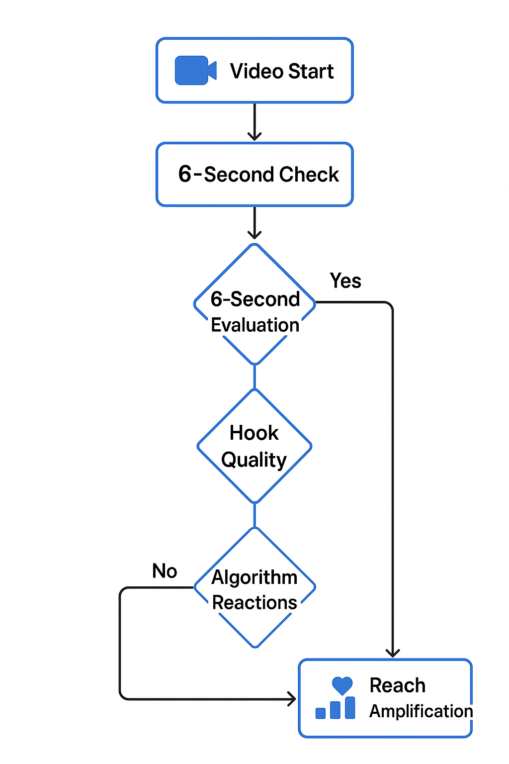 Multi-Stage-Bewertung: Der Algorithmus führt eine mehrstufige Bewertung durch: Erste 0,5 Sekunden (Thumbnail-Performance), 3 Sekunden (Initial Engagement), 6 Sekunden (Retention Decision), 15 Sekunden (Quality Score). Jede Stufe öffnet oder schließt Reichweiten-Potenziale.
