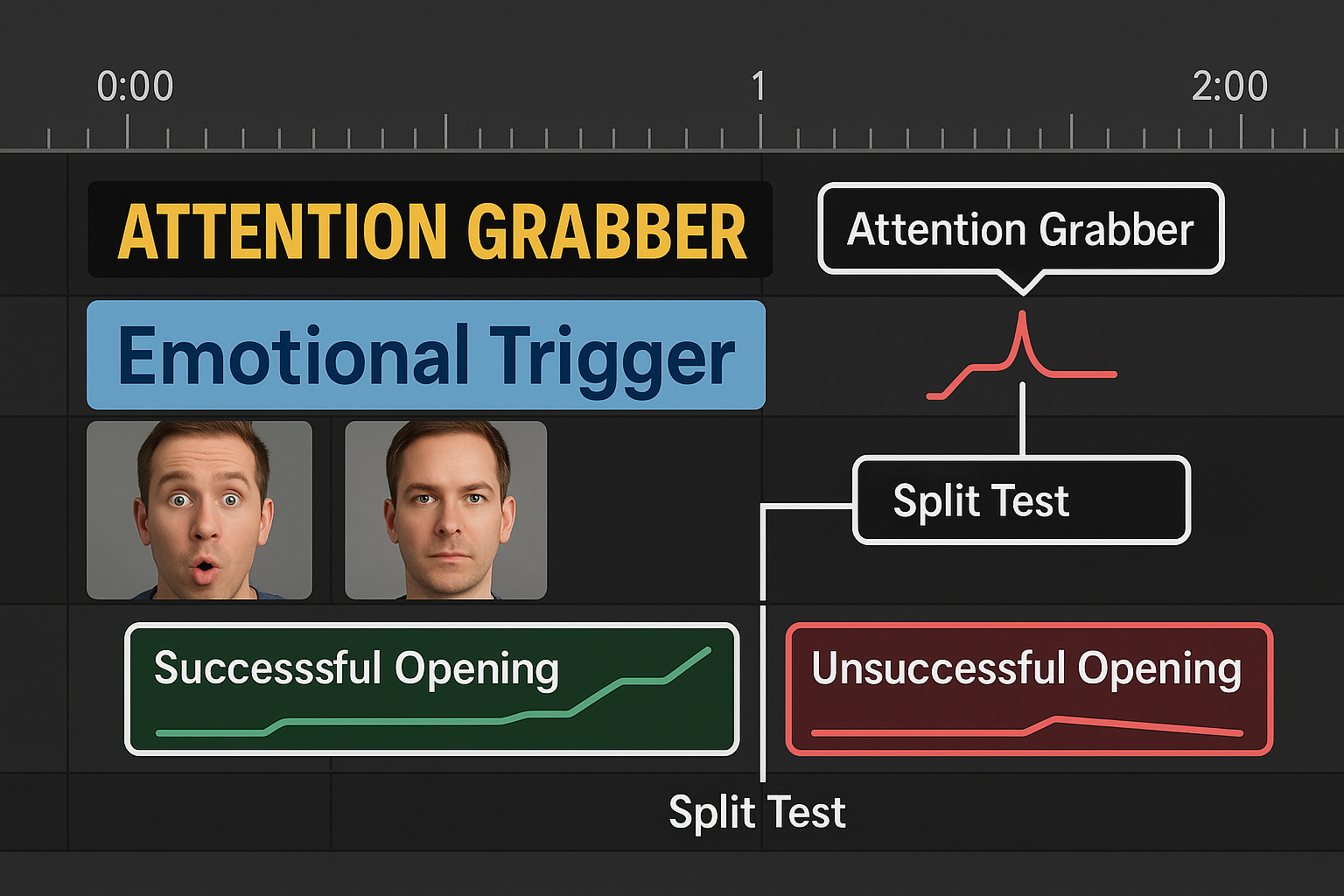 Pattern Interrupts: Durchbrechen Sie visuell erwartbare Muster. Wenn Ihr Nischen-Standard ruhige, ästhetische Videos sind, beginnen Sie mit schnellen Bewegungen. Bei action-lastigen Nischen wirken ruhige, meditative Momente als Pattern Interrupt.