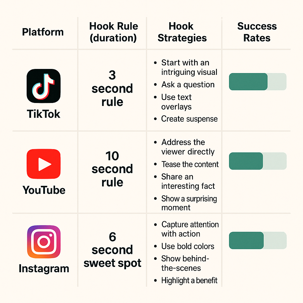 TikTok vs. Instagram: TikTok optimiert auf die ersten 3 Sekunden und belohnt schnelle, intensive Aufmerksamkeits-Peaks. Instagram hingegen bevorzugt sustained attention über 6 Sekunden. Diese Unterschiede erfordern völlig verschiedene Hook-Strategien.