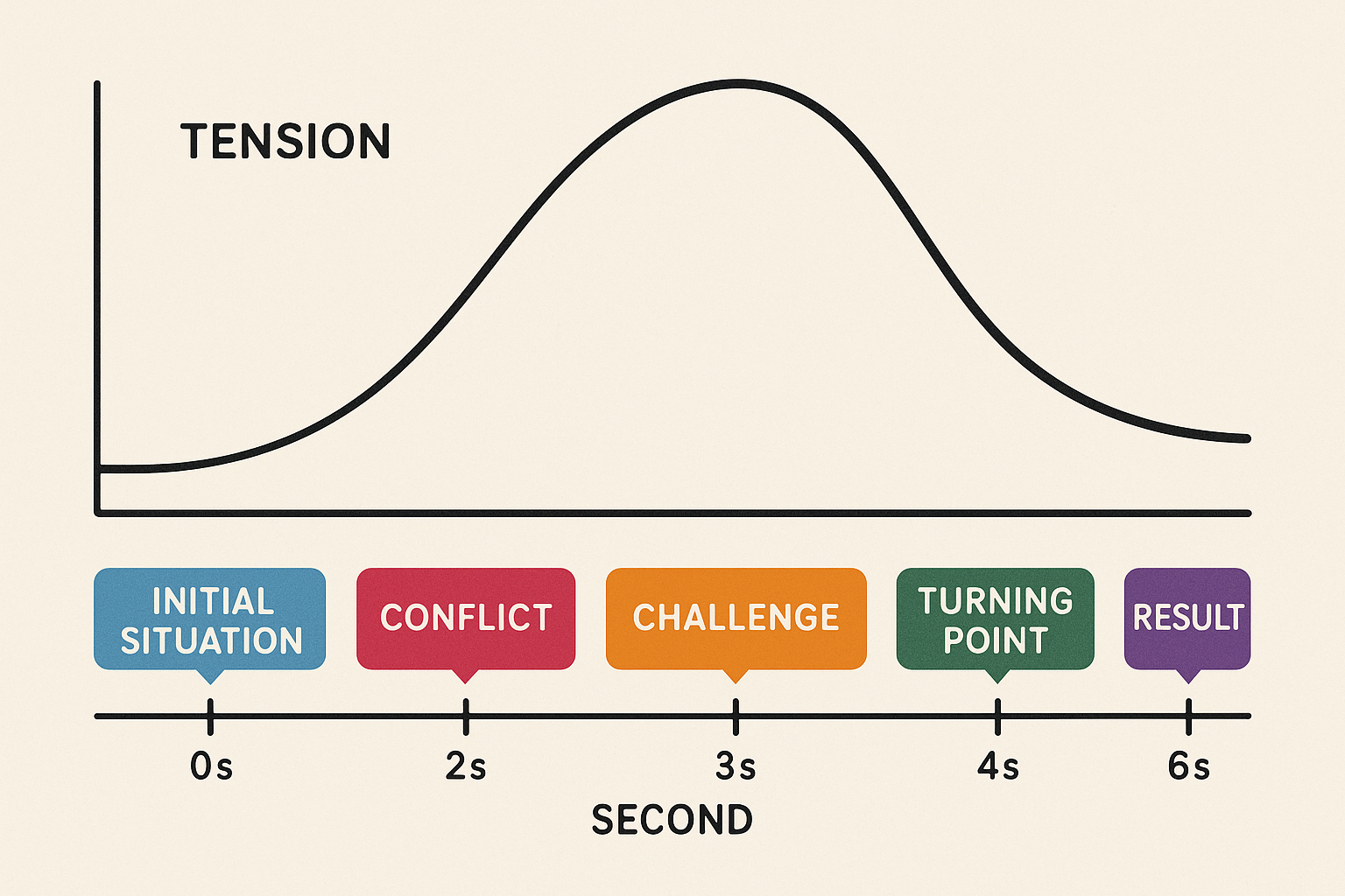 Story-Arc-Kompression: Eine komplette Story in 6 Sekunden erfordert extreme Kompression. Fokussieren Sie auf den emotionalsten oder überraschendsten Aspekt. Details können im Hauptvideo folgen.