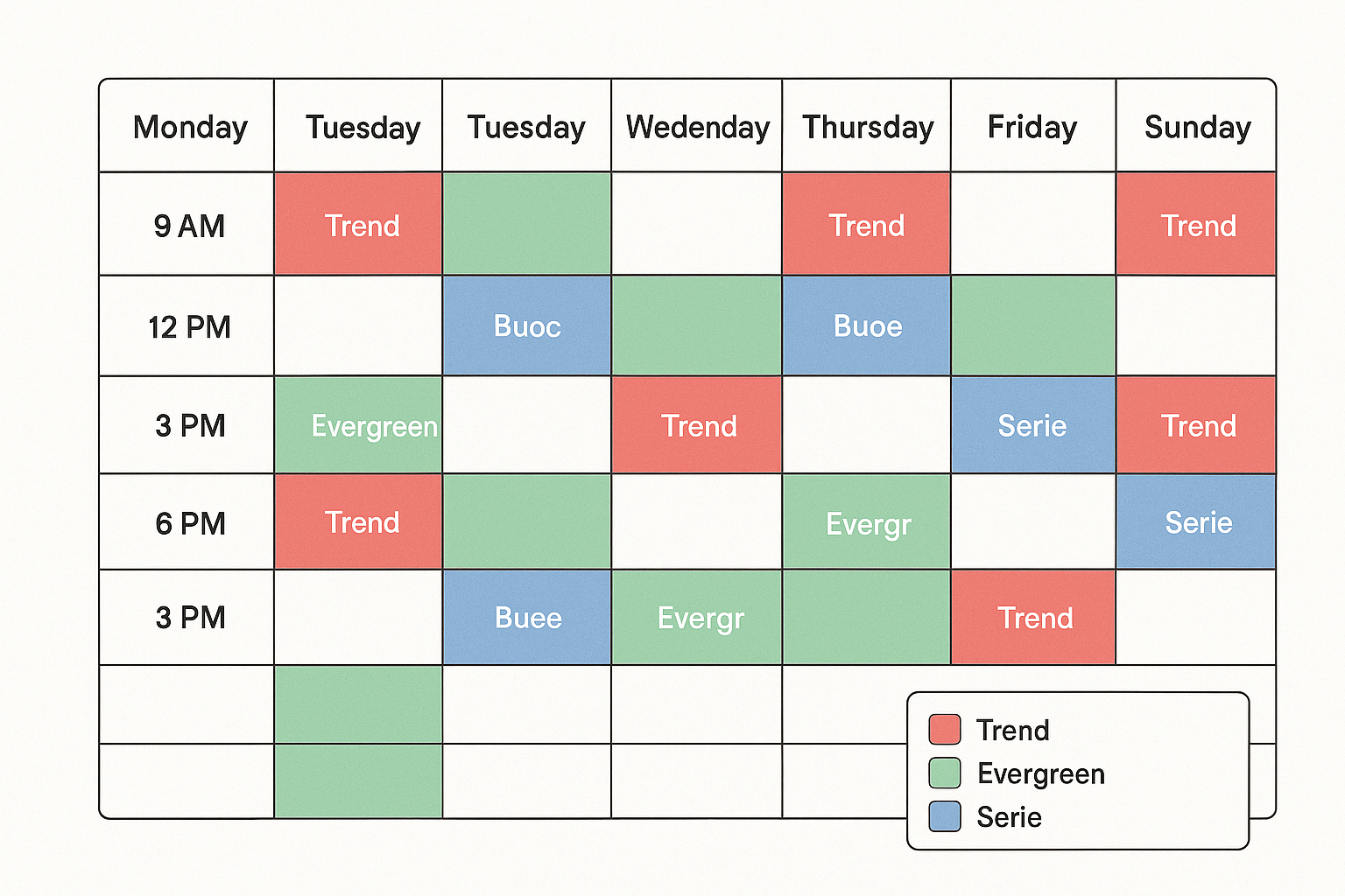 Konsistenz ist wichtiger als sporadische Viralität. Ein Redaktionsplan hilft dir, am Ball zu bleiben und den Algorithmus kontinuierlich mit Signalen zu füttern.