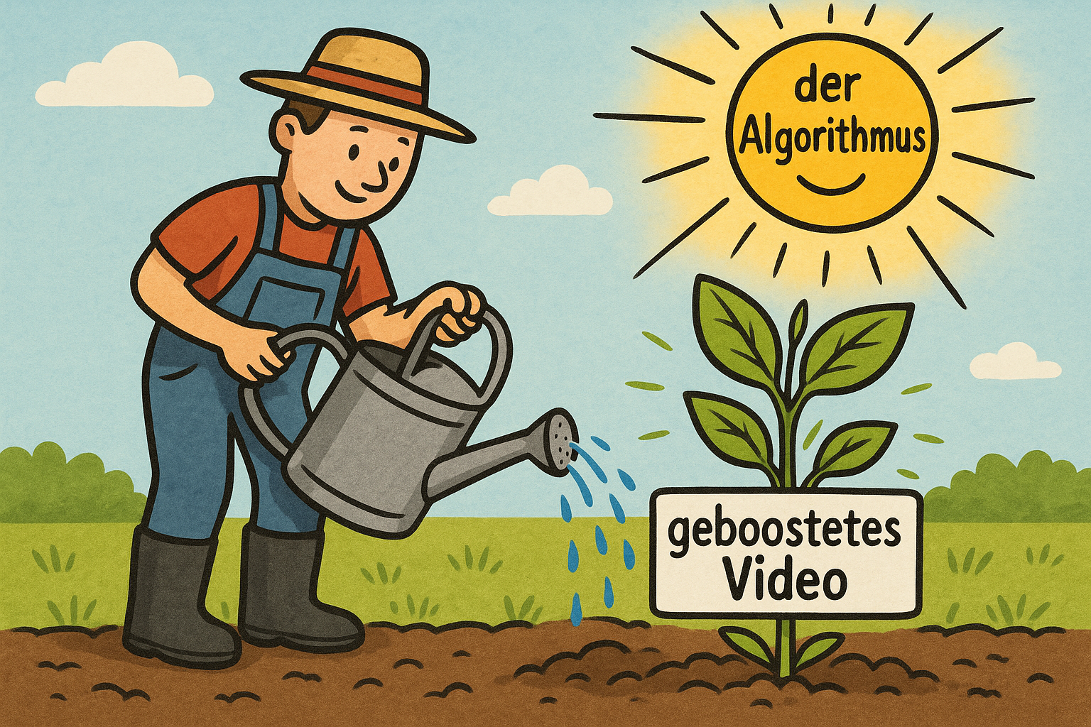 Gärtner gießt geboostetes Video-Pflänzchen im Algorithmus-Sonnenschein