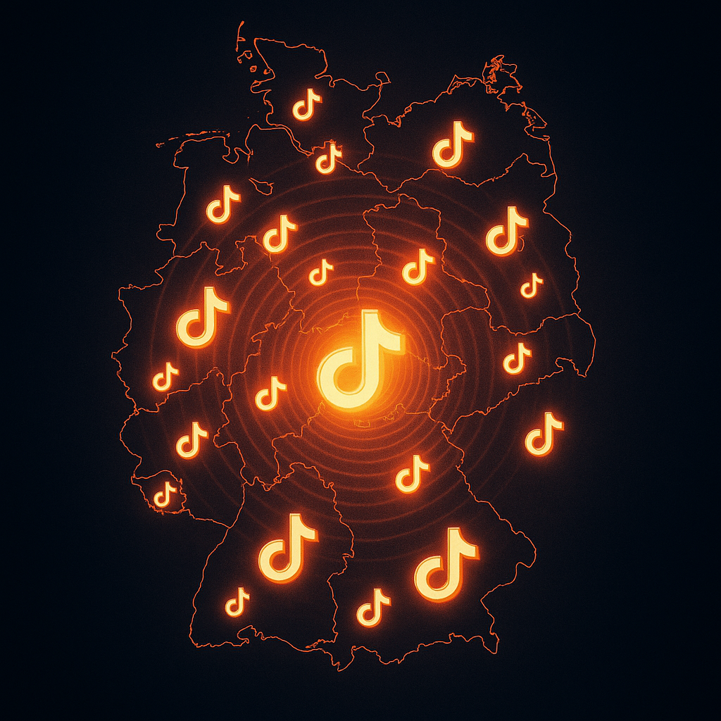 Deutschland-Karte mit pulsierenden TikTok-Symbolen und Welleneffekt