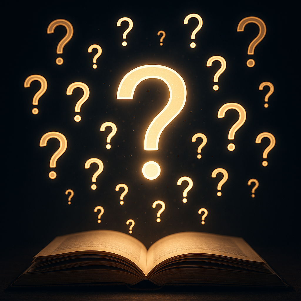 Häufige Fragen schweben über aufgeschlagenem Buch