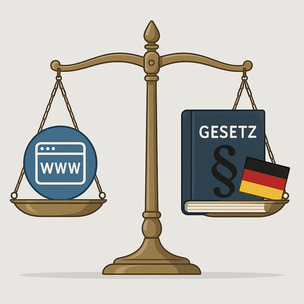 Scales of justice balancing website marketing with German legal compliance and regulations