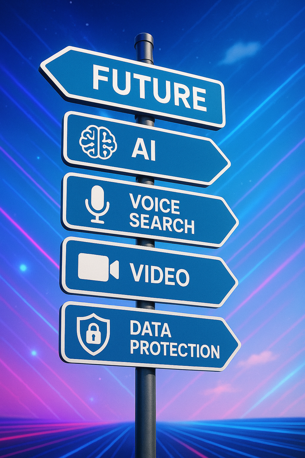 Future-pointing signpost displaying emerging digital marketing trends including AI, voice search, and privacy