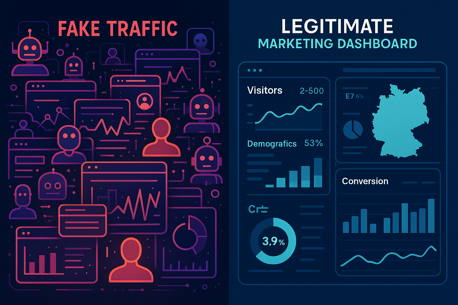 Split-screen comparison of fake traffic versus legitimate marketing strategies for German website visitors
