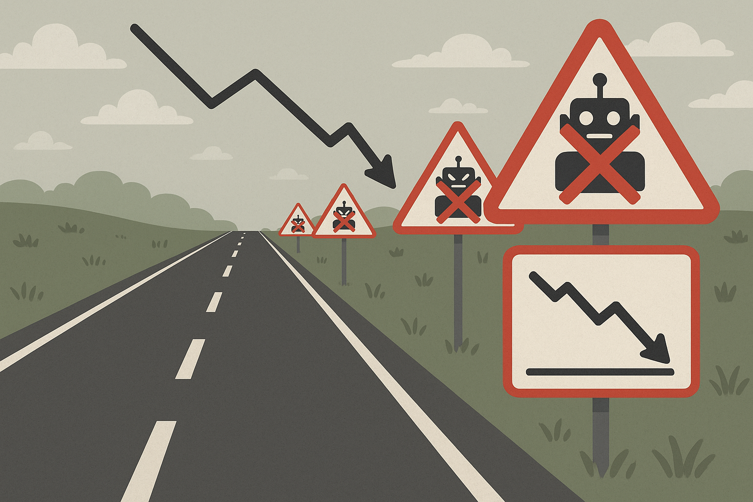 Warning road signs highlighting common traffic purchasing pitfalls including bot traffic and low conversion