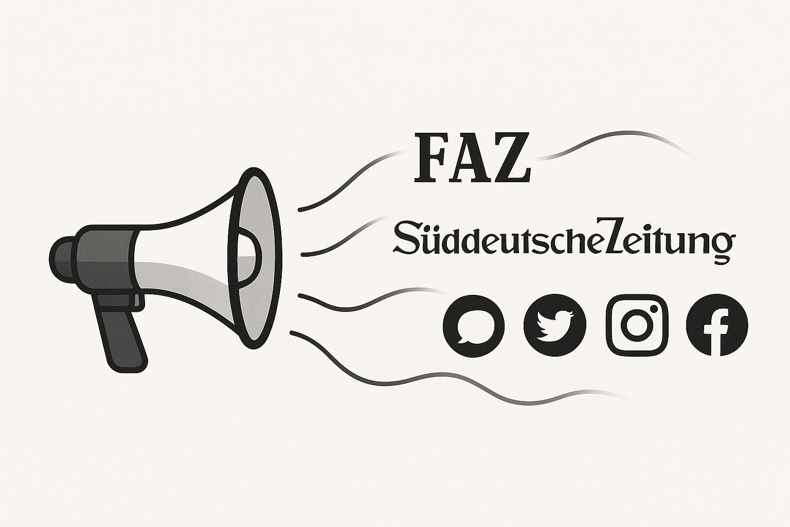 Megaphone broadcasting messages that transform into German media and social media logos