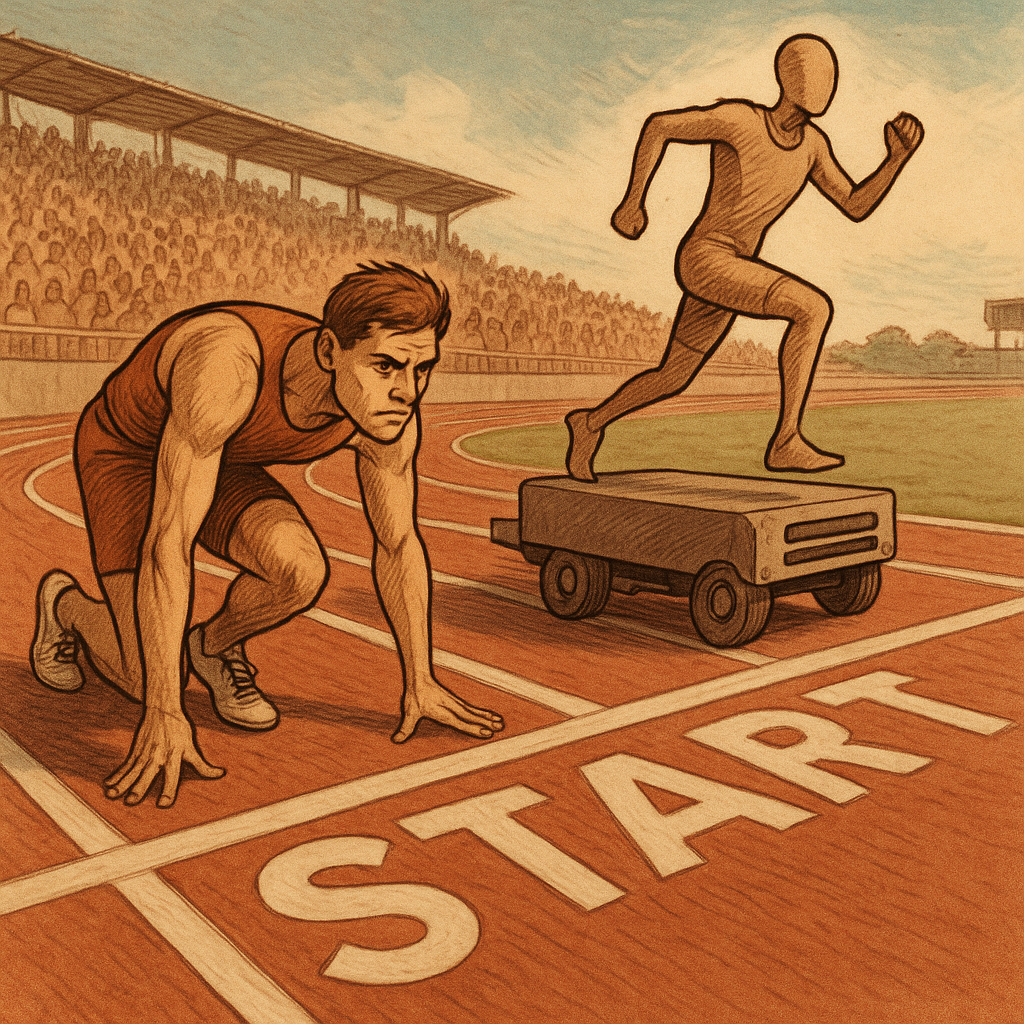 Startlinie mit organischem und gekauftem Likes-Läufer auf motorisierter Plattform