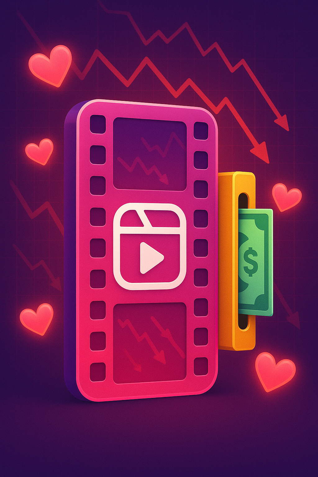 Instagram Reel als Filmstreifen mit Geldschlitz und fallender Reichweiten-Kurve