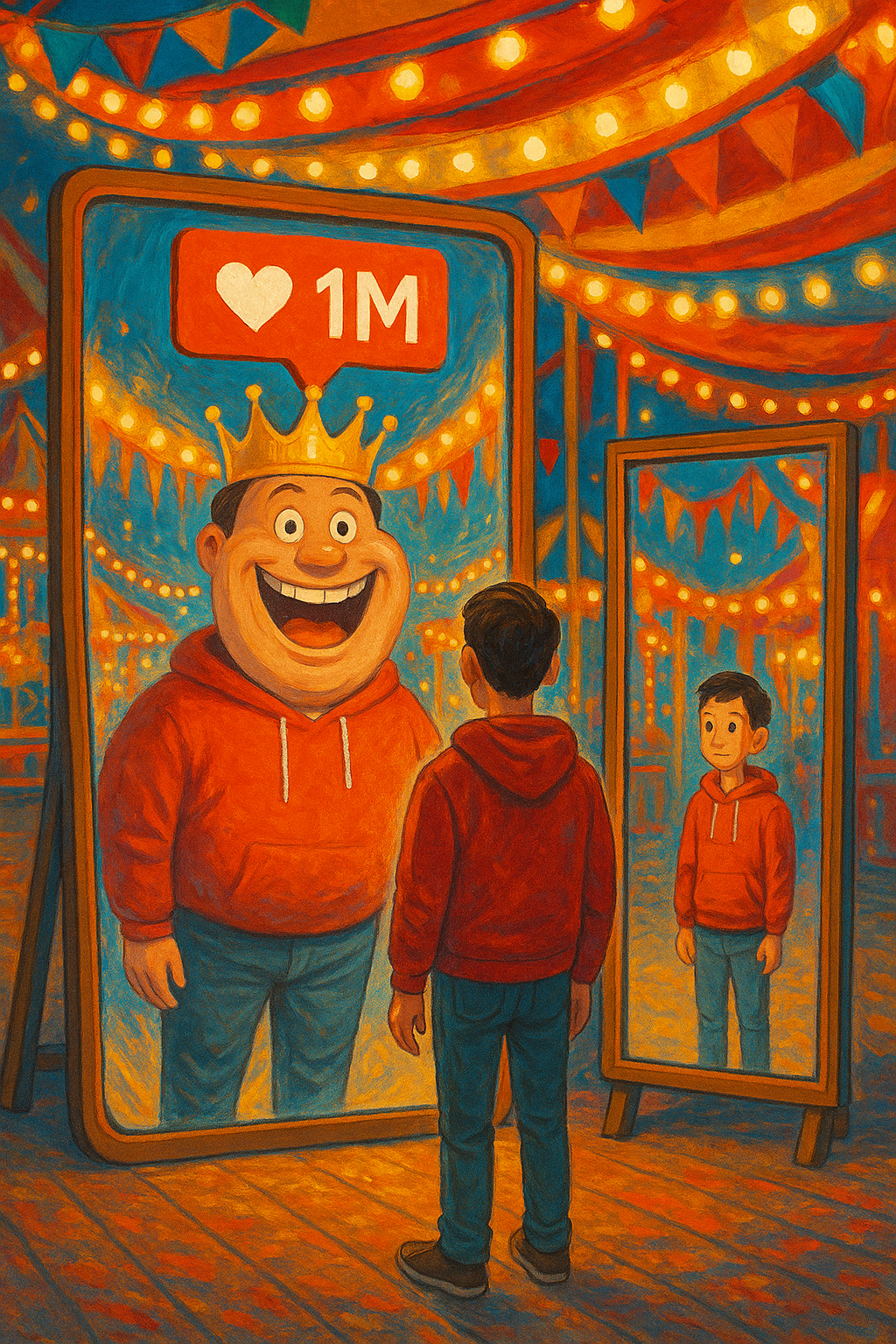 Zerrspiegel symbolisiert die trügerische Verlockung des schnellen Scheins versus authentisches Selbst