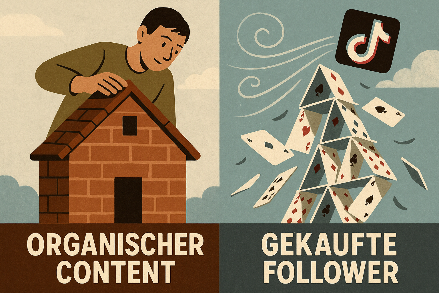 Vergleich zwischen organischem Content-Aufbau und gekauften Followern als instabile Kartenhäuser