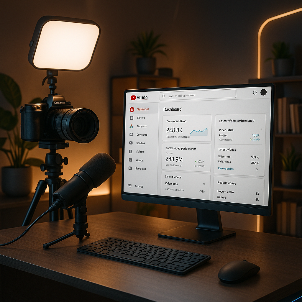 Professioneller YouTube-Creator-Arbeitsplatz mit modernem Setup für 2025
