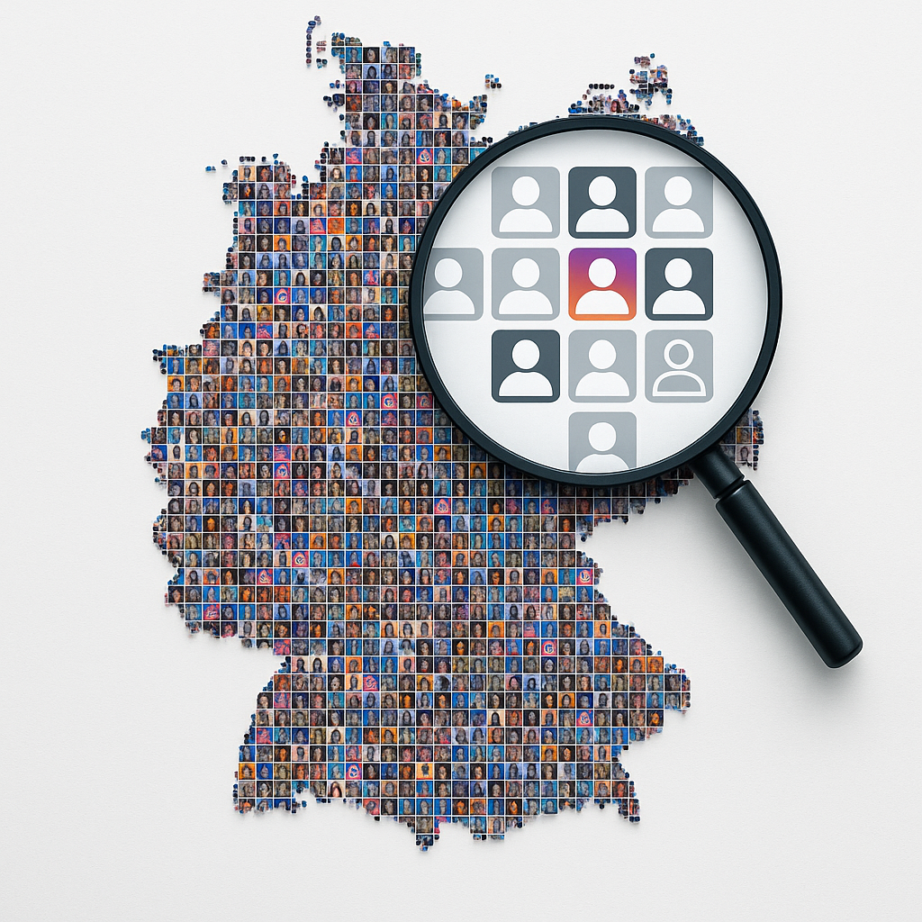 Deutschlandkarte aus Instagram-Profilen mit Lupe, die Fake-Accounts hervorhebt