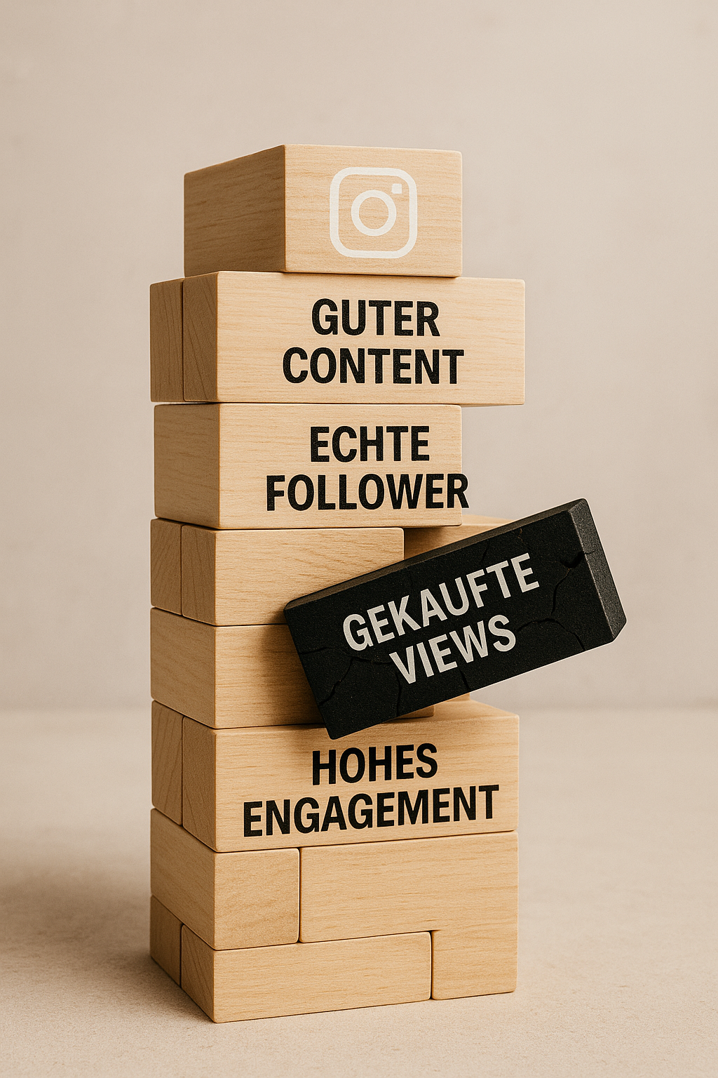 Jenga-Turm zeigt wie gekaufte Views die Stabilität des gesamten Instagram-Accounts gefährden
