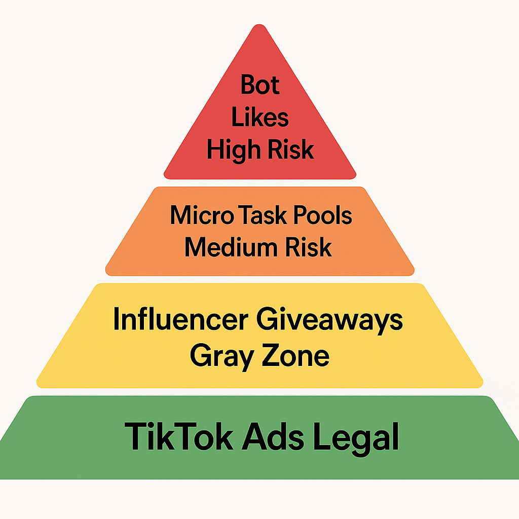 Bei Giveaways wird ein Like als Bedingung für die Teilnahme an einer Verlosung gefordert. In Engagement-Pods (Gruppen auf Discord oder Slack) verpflichten sich Mitglieder, die Inhalte der anderen zu liken. Beides erzeugt Likes von echten Menschen, aber das Engagement ist erzwungen und nicht auf den Content bezogen. TikTok toleriert dies in geringem Maße, aber exzessive Nutzung wird ebenfalls als künstliches Engagement gewertet. Bewertung: Kurzfristig nützlich, langfristig nicht nachhaltig.